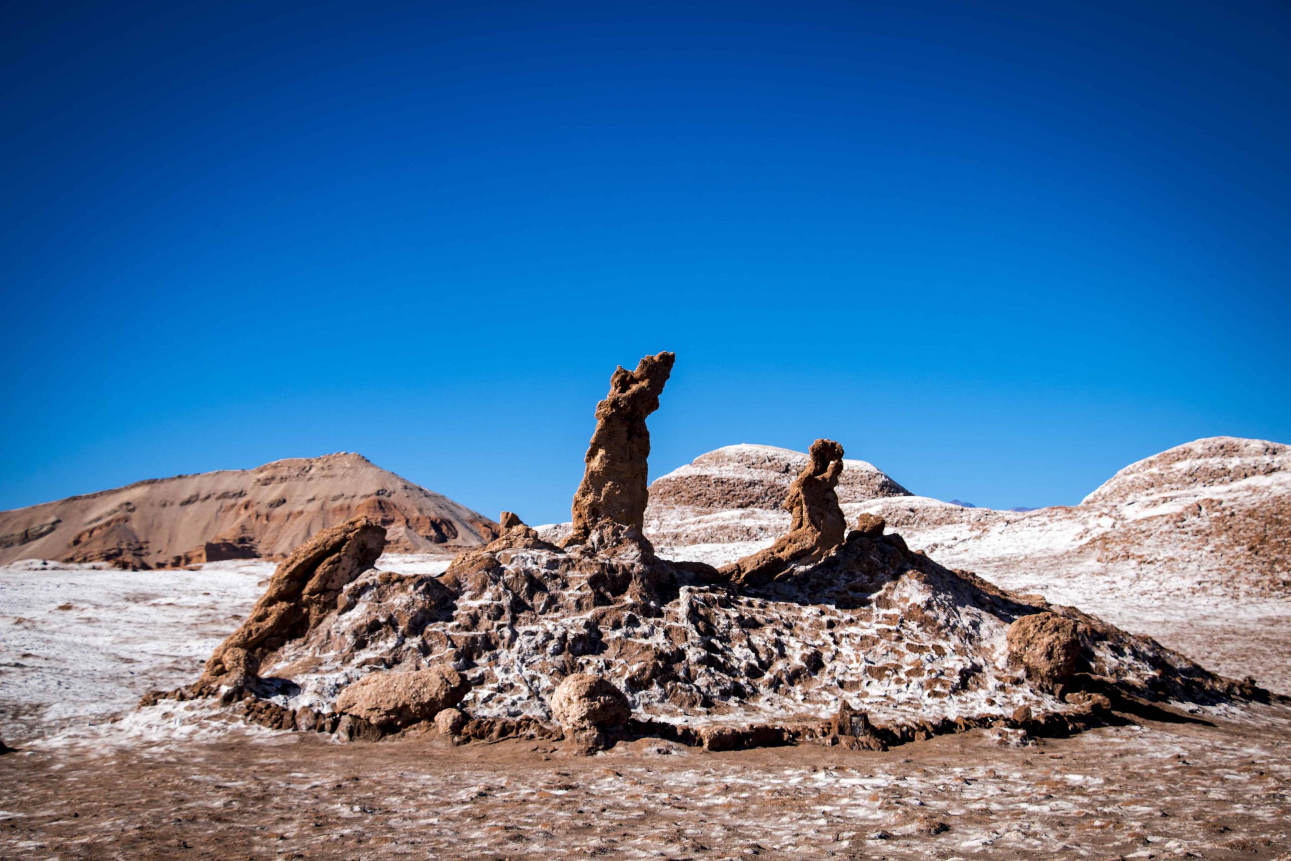 A primeira parada é na formação rochosa conhecida como as três marias, que você vê na foto abaixo. Essa formação foi batizada assim por um sacerdote jesuíta chamado Gustavo Le Paige, um estudioso e pesquisador da cultura atacameña.