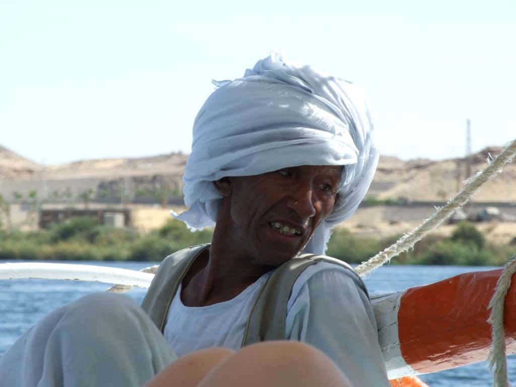Partimos de Aswan em uma felucca, pequenos barcos tradicionais da região. Esse passeio de felucca é muito interessante. Você desce o Nilo de sul à norte, em direção à Luxor, parando em uma ilha da região para dormir, dentro do barco. É uma atividade muito legal e tranquila, com algumas peculiaridades. Primeiro, a água do Nilo é muito contaminada, não beba dela de forma alguma. Nem tampouco coma alimentos que usem a água do rio no seu preparo. Outra questão importante é que não há banheiros em sua parada, ou seja, necessidades fisiológicas só no mato mesmo. Essas peculiaridades, ao meu ver, só fazem o passeio ser mais divertido, já que sair da zona de conforto me atrai. Ah, o passeio normalmente inclui refeição, que é preparada pelos locais que conduzem a felucca. A felucca que pegamos era conduzida por senhores locais, idosos, e a comida que eles nos serviram foi certamente preparada com água do Nilo. Mas eu sobrevivi, ainda bem. De 3 pessoas que viajavam comigo, as 3 sofreram com “problemas estomacais” em razão da água do rio. Na realidade, se você escapar da viagem pelo Nilo sem se sentir mal, você pode se considerar um sortudo. Apesar dos pesares, achei o passeio de felucca um dos pontos altos da viagem, e foi lá que tirei uma das fotos que eu mais gostei na viagem: