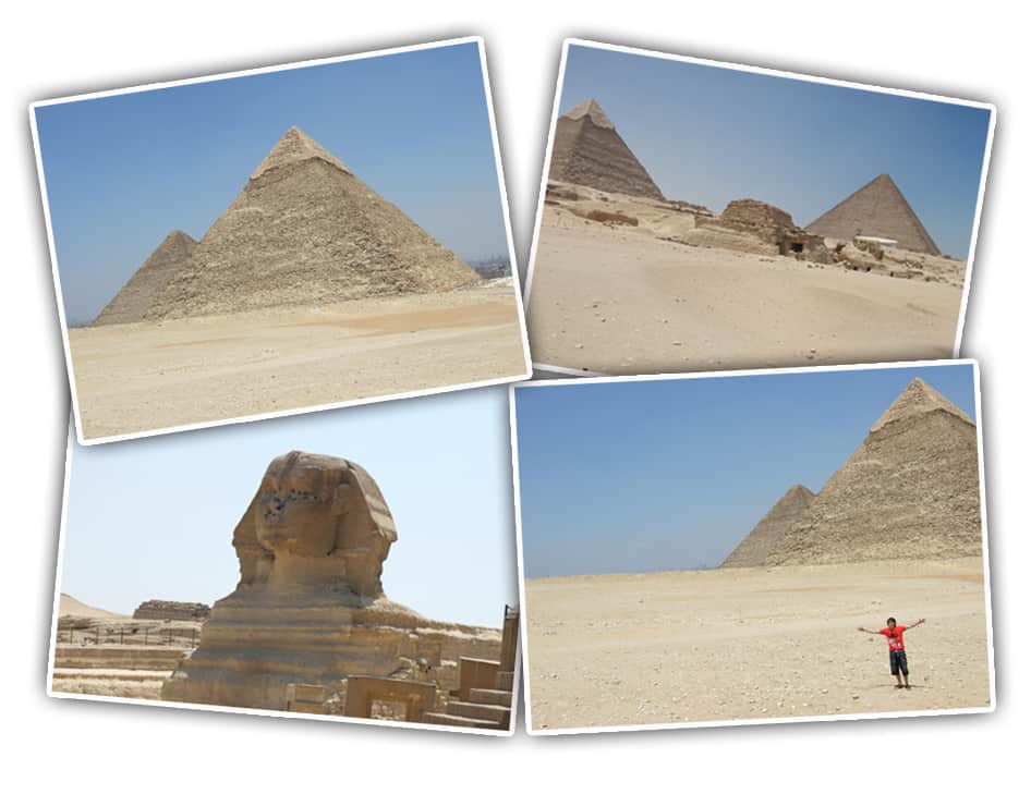 No dia seguinte era dia de visitar as Grandes Pirâmides de Guiza. Antes de irmos às pirâmides conhecemos também o complexo de Saqqara, trinta quilômetros ao sul do Cairo. Partimos novamente da favela ao redor do complexo, e mais uma vez em um camelo. O lugar é espetacular, não há palavras para descrever a grandiosidade, que ficou melhor refletida nas fotos que tirei (veja o álbum aqui). Meu melhor conselho nessa visita é estar preparado para o sol e para o calor. Muita água e, quando possível, sombra. Isso sem falar no protetor solar, companheiro inseparável para quem vai encarar o deserto.