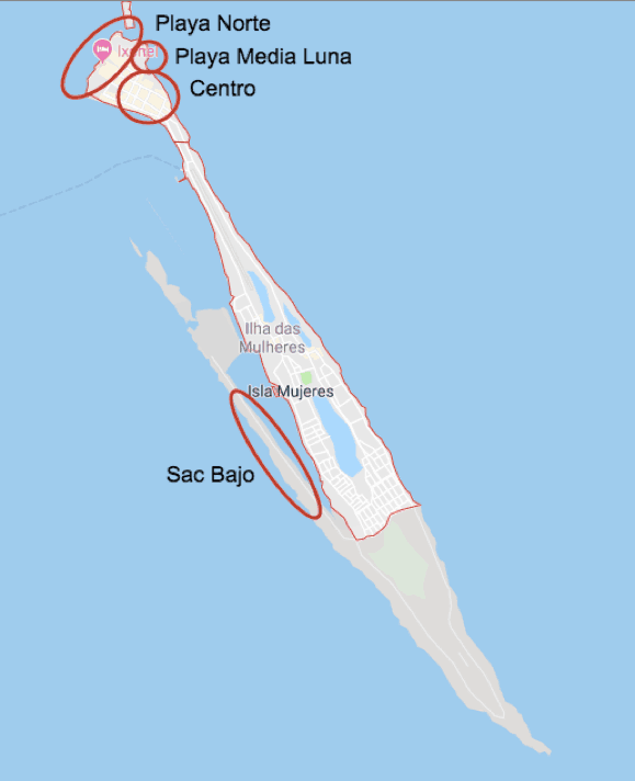 No entanto, como a ilha é pequena, nada impede que você se hospede em Sac Bajo, na costa oeste de Isla Mujeres, ou em Playa Media Luna, na costa leste de Isla Mujeres, ou mais ao sul da ilha. Se optar por se hospedar na costa leste ou sul de Isla Mujeres será necessário ir de taxi ou alugar um carrinho de golfe ou bike para ir até o centro e Playa Norte. Já Playa Media fica bem próxima da Playa Norte, sendo possível ir caminhando.