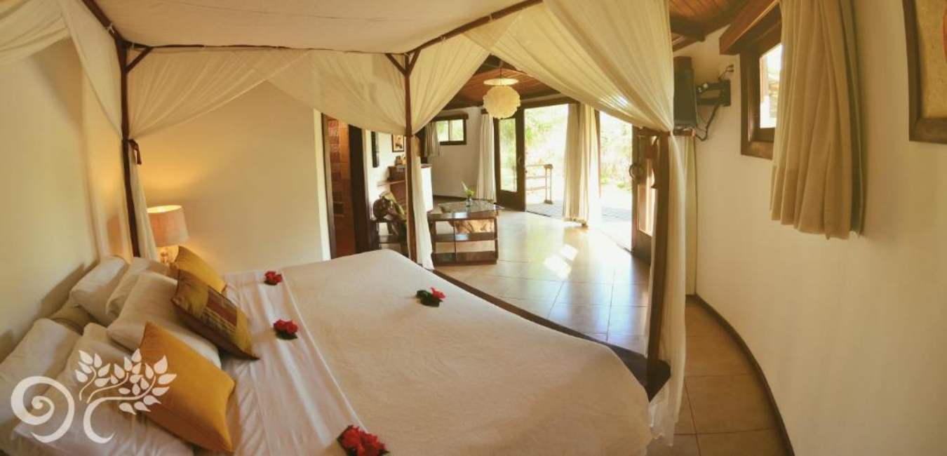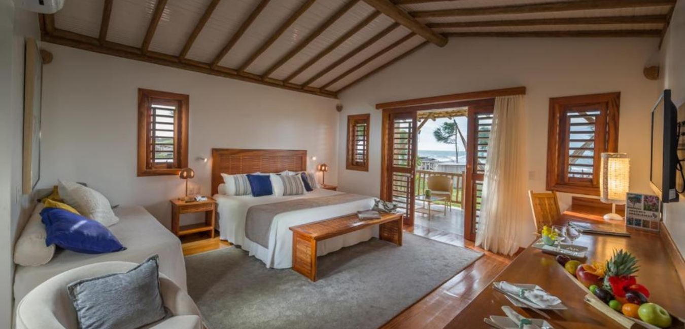 O local tem vista para o mar, piscina, serve um buffet de café da manhã e tem opções de suíte ou bangalô.
