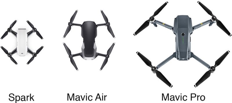 O bichinho é muito pequeno e cabe facilmente no seu bolso, sendo certamente o melhor no quesito tamanho. Dá para dizer que o Spark é o menor drone que você pode comprar (considerando um certo nível de qualidade de imagem e funcionalidades). Veja abaixo um comparativo de tamanho entre o Spark, o Mavic Air e o Mavic Pro: