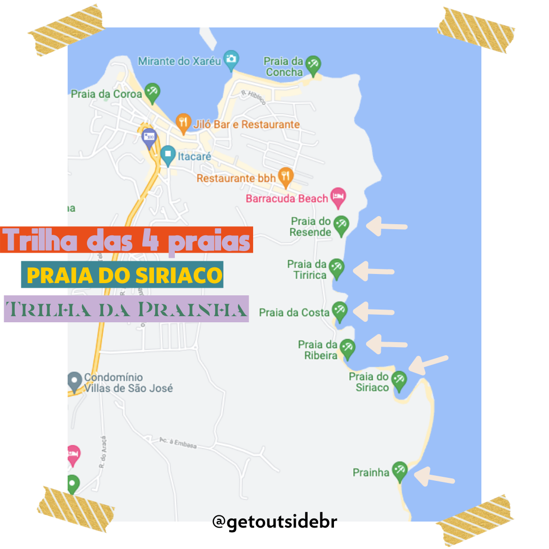 Você pode ir caminhando, pegar o transporte ou ir no seu veículo até a Praia do Resende, que fica a 1km do centrinho de Itacaré, para começar a caminhada pelas 4 praias e depois seguir para a trilha da Prainha. Tem lugar público para estacionar na Praia do Resende, Praia da Tiririca ou Praia da Costa.