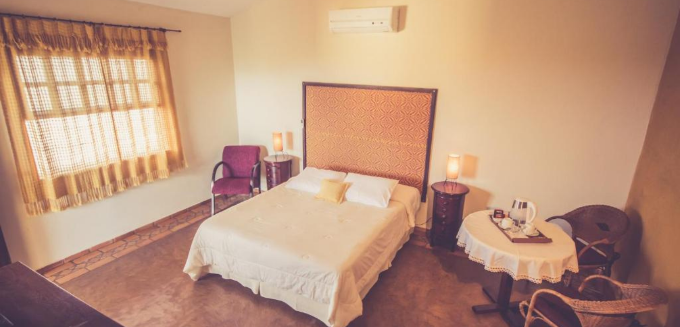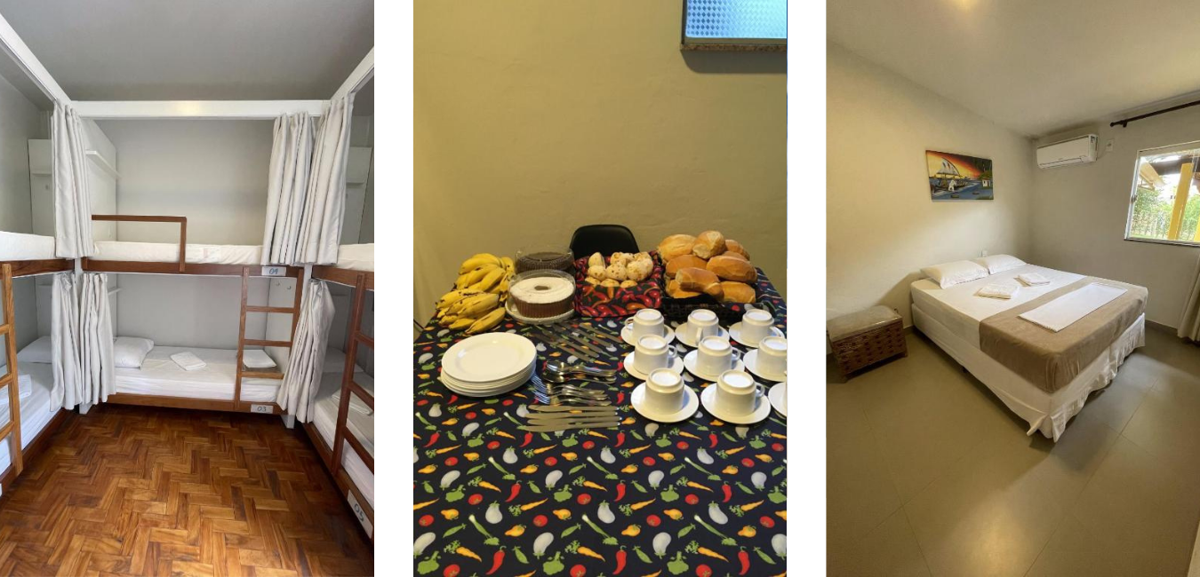 Além dos quartos confortáveis, a hospedagem também possui piscina e buffet de café da manhã.