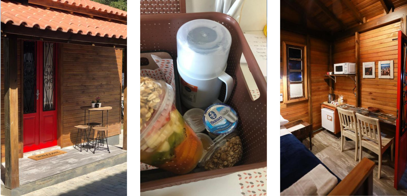 Os chalés contam com varanda, utensílios básicos de cozinha e tem opção de café da manhã à la carte.