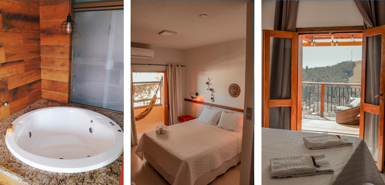 Com aquele clima gostoso de montanha, alguns quartos também contam com banheira de hidromassagem.