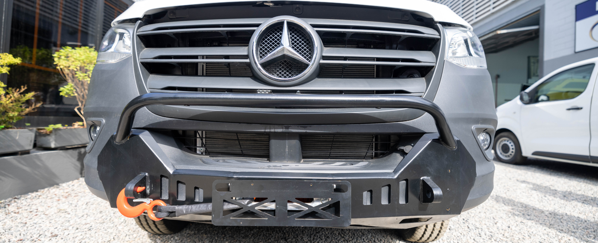 Este é o primeiro ponto de contato com qualquer obstáculo na trilha. Um pára-choque de impulsão robusto protege a parte frontal do seu veículo contra danos causados por pedras, troncos e outros detritos. Além disso, o pára-choque de impulsão ajuda a proteger o veículo de danos em caso de colisão frontal e em uma emergência pode ser usado pra empurrar objetos leves ou mover outros veículos.